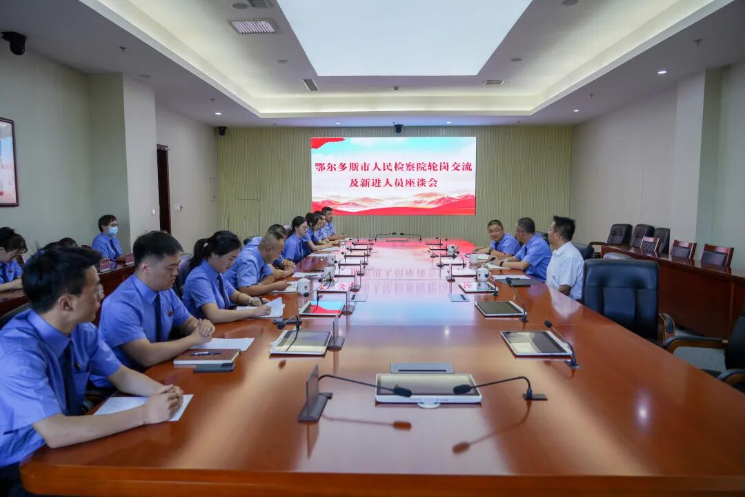 8月1日,鄂尔多斯市人民检察院组织召开2024年度轮岗交流及新进人员座谈会。市院党组成员、派驻纪检监察组组长乔四厚,党组成员、政治部主任纪科出席会议并讲话,2024年以来市检察院新入职的9名检察人员及进行岗位调整的12名检察人员参加会议。会议由市检察院政治部副主任王伟主持。
