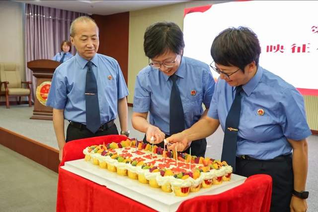 温馨的生日乐曲缓缓响起,工作人员推上特意定制的政治生日蛋糕。各党支部书记一同上台点亮蜡烛,柔和的烛光映照着一张张坚毅的面庞。大家默默许下心愿——愿党的事业永葆青春,愿检察工作再谱新篇。